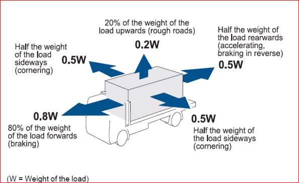 - 50% (0.5W) of the weight of the load should be restrained from moving in either lateral direction (left or right, cornering) = 2.5 tonne