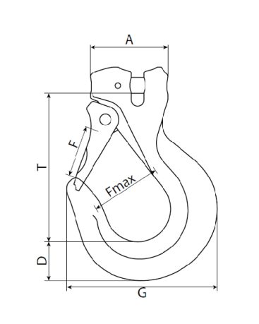 | CHAIN SIZE (mm) | WLL (tonnes) | A (mm) | B (mm) | C (mm) | D (mm) | F (mm) | Fmax (mm) | G (mm) | T (mm) | WEIGHT (kg) |