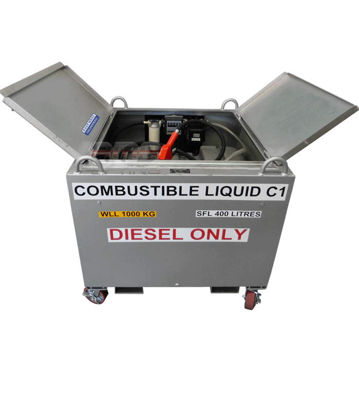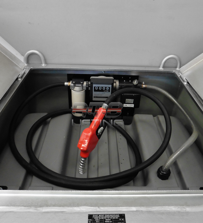 The heavy-duty, portable enclosure contains a diesel transfer fuel pump with suction filter, fuel usage meter, replaceable in-line 30 micron particulate fine filter, 4 metre long delivery hose and auto cut-out nozzle.