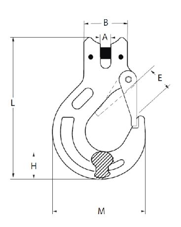| SIZE (mm) | WLL (tonne) | WEIGHT (kg) | A (mm) | B (mm) | E (mm) | H (mm) | M (mm) | L (mm) |