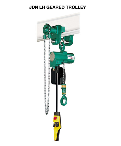 The JDN Reel Chain Trolleys are available for both the PROFI and Mining Air Hoists as a geared trolley (LH). This allows for load movement by operating the hand chain mechanism. The carrying capacities go up to 20 tonne.
